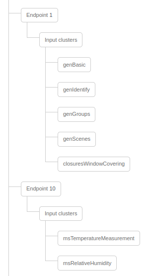 Endpoint 1 (the main one) is a window covering device, handling the minimum mandatory Zigbee clusters and the covering cluster. Endpoint 10 is a temperature sensor device, on which I’ve put the temperature and humidity measurement clusters.
