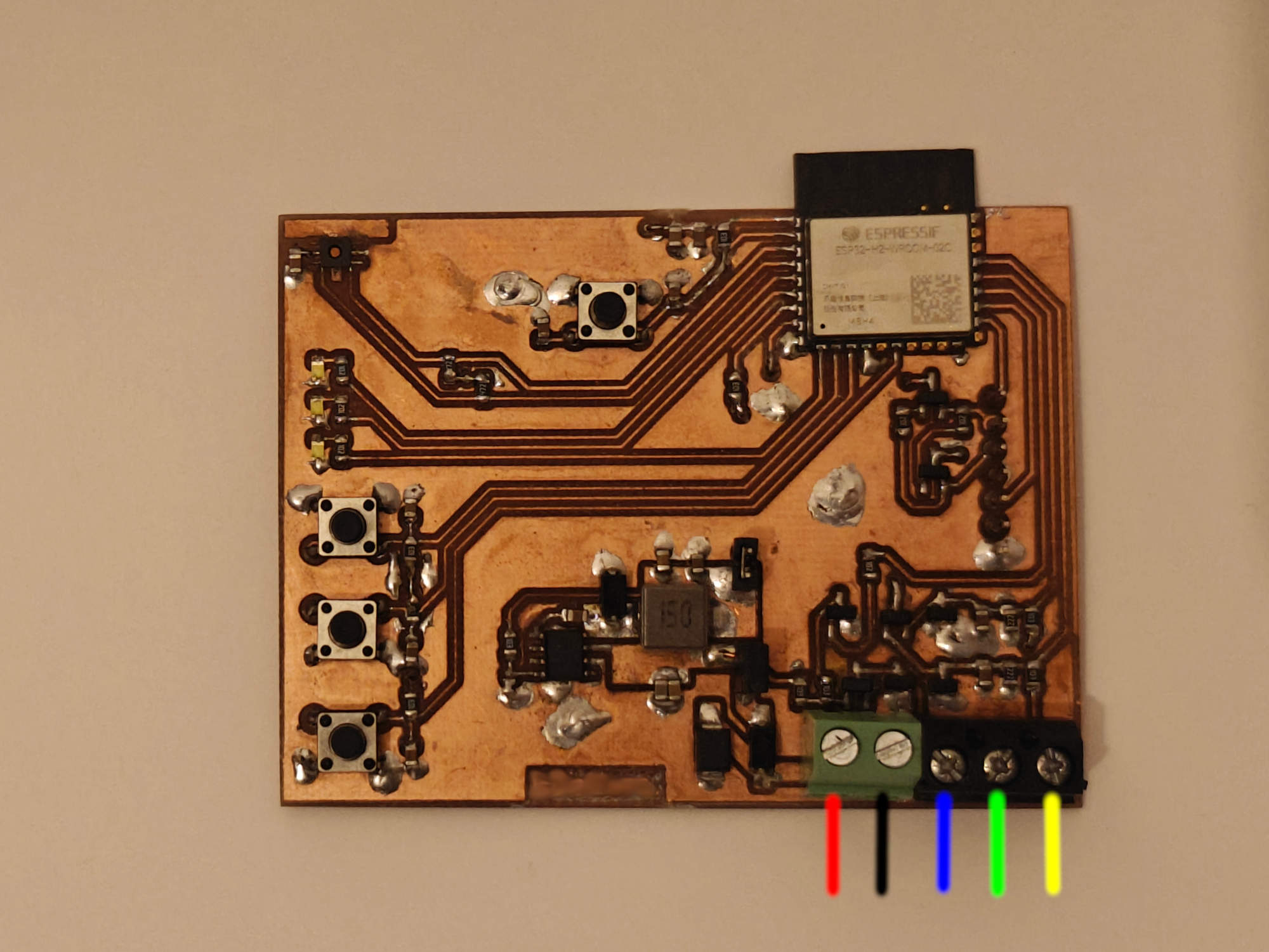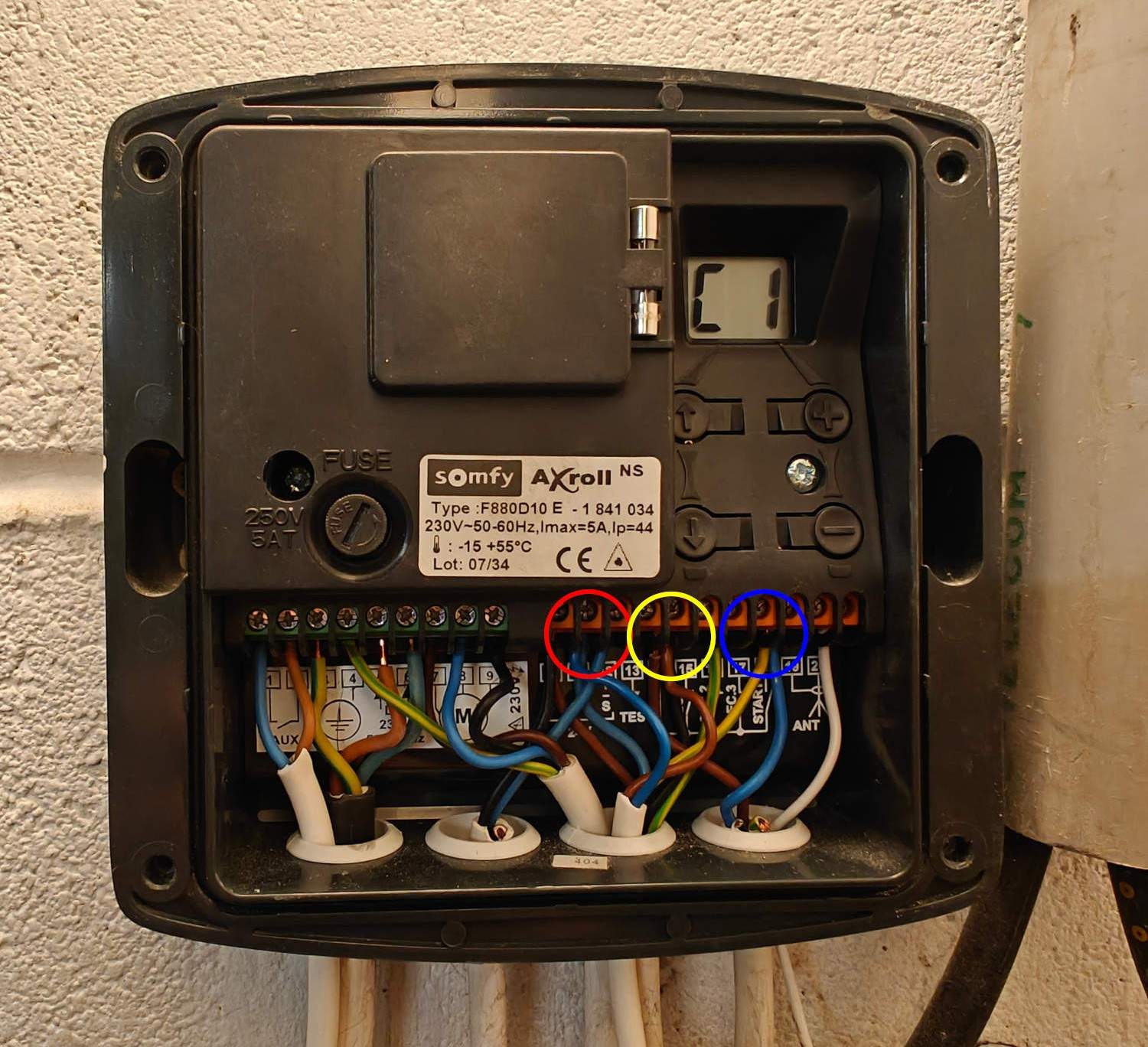 As you see, it’s a Somfy controller. I retro-engineered it and found some ~16V power available between the contacts circled in red and yellow. The physical switch for the open/close operation is connected to the blue-circled contact. Next step is to make an electronics board to control it.