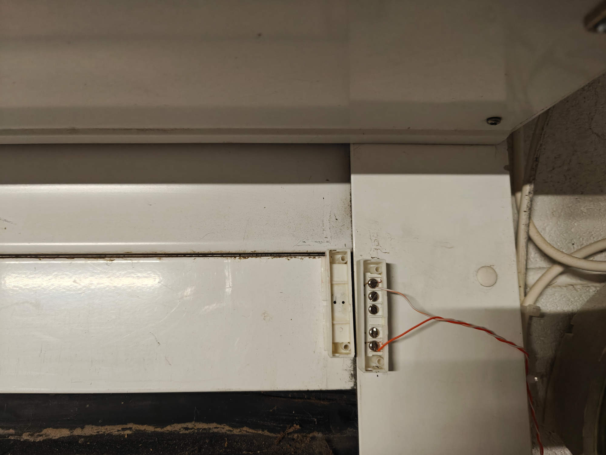 Finally, the open/close sensors are reed switches. A reed switch is composed of a small metal piece, that closes the electrical contact when it’s close to a magnet. I’ve put the reed switch on the roller door frame and the magnet on the moving part, as you can see below.