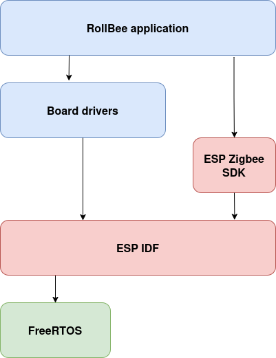 I split my software on two levels, as shown on the following diagram. The base blocks (provided by Espressif) are the IDF and Zigbee SDK as described above. I built my board drivers on top of the IDF and the application itself on top of the board drivers and the Zigbee SDK.